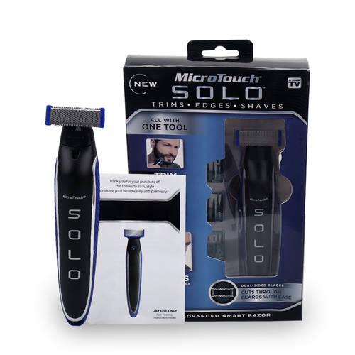 Nella confezione sono inclusi tre pettini (da 1mm, 3mm e 5mm) per regolare la barba. Micro Touch Solo è fornito di una batteria agli ioni di litio con durata di 45 minuti e di una luce a LED che consente una rasatura perfetta. Tutto questo senza utilizzare ne acqua ne creme da barba.
