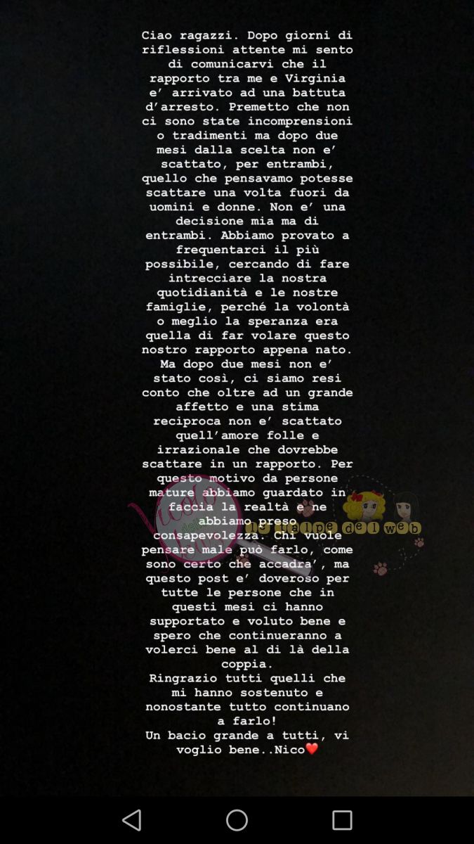 Anche Virginia poco più tardi ha voluto dire la sua confermando la fine della loro storia d’amore:
