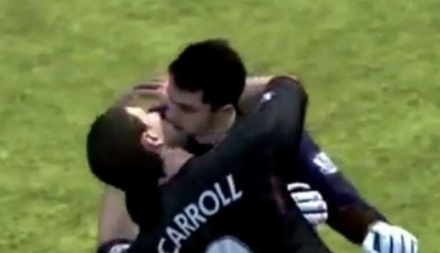 Leggi tuttoSuccede nel calcio inglese. I due calciatori Scholes e Neville festeggiano la vittoria con un bellissimo bacio sulle labbra.