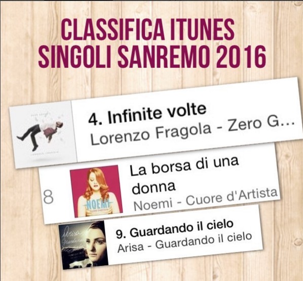 Leggi tuttoSanremo 2016 Lorenzo Fragola già in cima alla classifica iTunes. Tra i singoli più scaricati oggi delle nuove canzoni sanremesi